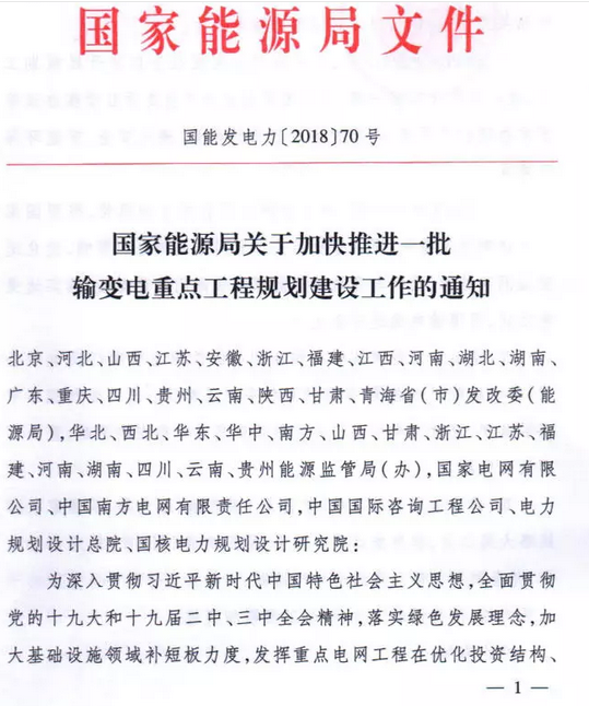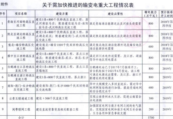 9月7日獲悉,國家能源局印發(fā)《關(guān)于加快推進一批輸變電重點工程規(guī)劃建設工作的通知》國能發(fā)電力〔2018〕70號,《通知》指出,為加大基礎設施領域補短板力度,發(fā)揮重點電網(wǎng)工程在優(yōu)化投資結(jié)構(gòu)、清潔能源消納、電力精準扶貧等方面的重要作用,加快推進青海至河南特高壓直流、白鶴灘至江蘇、白鶴灘至浙江特高壓直流等9項重點輸變電工程建設,合計輸電能力5700萬千瓦(工程見附件)。